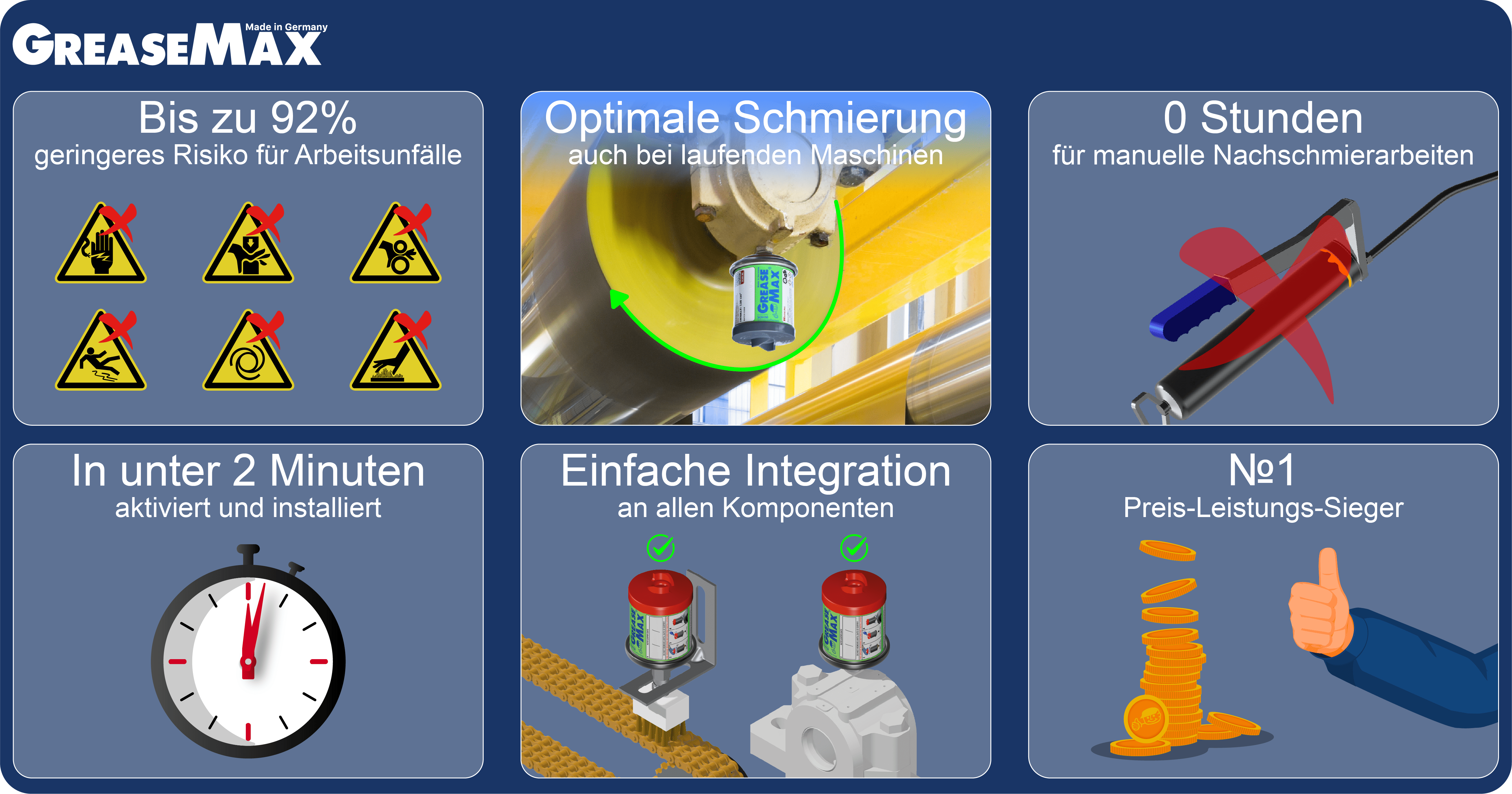 In der Fahrzeugproduktion entscheidet jede Stunde Verfügbarkeit über Produktivität und Termintreue. Wer Schmierung noch manuell organisiert, nimmt ein vermeidbares Risiko in Kauf, mit messbaren Konsequenzen für Verschleiß, Energiekosten und Stillstandszeiten. Automatische Schmierstoffgeber wie GREASEMAX® sind keine aufwändige Systemlösung, sondern eine robuste, einfach zu integrierende Ergänzung, die sich von der Presse bis zur Endmontage in jede bestehende Linie einbauen lässt.